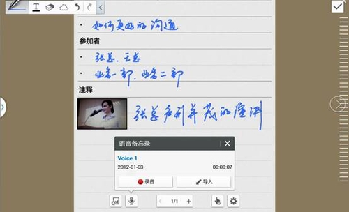 值得一提的是,通过点击插入“图片”的“相框”选项,你能够随意绘制相框,拍摄符合自己尺寸、形状需求的各种照片,从而让你的会议记录更加清晰生动。另外,“语音备忘录”功能可以对会议过程中的重要人物讲话进行原音重现。而“图文联想”功能,更能让缺乏绘画天赋的用户轻松地将所需图案加入到笔记中。比如在屏幕上写下“汽车”两个字,系统将自动识别出类似的图案供你选择。有了它,你的会议记录将更加活灵活现。