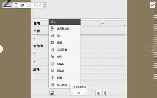 打开“S Note”,最先呈现的就是品类繁多的笔记模板,内容涉及会议笔记、检查清单、计划表、食谱、旅行笔记、宝宝日记等,用户可根据自己的实际需求选择设置。你可以使用“会议笔记”模板轻松记录会议议程。打开“会议笔记”,带有“时间、日期、日程、参加者、注释”选项的精美模板就会呈现在眼前。在相应的位置替换文字,同时插入“语音、图片、视频、图表”等内容,一篇图文并茂的会议日志便出炉了。