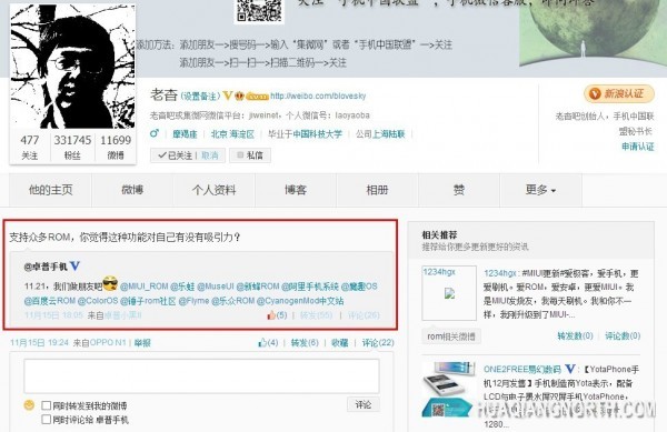 日前,卓普手机官方微博卓普又发布一条颇具暧昧意味的信息,分别一一@了几乎所有国内外知名的ROM厂商,并表示11月21日要在一起。结合这些,令人不禁认为它们俩是否真的要在一起。