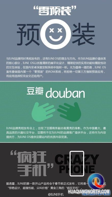 此外,IUNI表示将做到ROM系统“零预装”,拒绝一切第三方强制预装应用。豆瓣商务副总裁黄亮也出现在发布会上,这表明IUNI将与豆瓣合作,豆瓣将成为IUNI的品牌推广平台与内容提供方。
