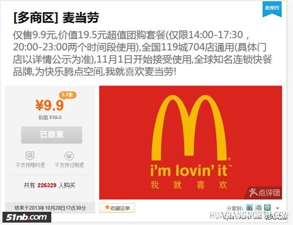 10月28日,大众点评网旗下的点评团网站打出了9.9元的麦当劳超值团购套餐,号称119城市的704店通用,仅花费9.9元就能够买到原价19.5元的超值套餐。这一团购受到了极大的欢迎,瞬间售出了二十多万份。