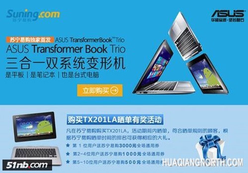 常言道:“以小见大”,轻巧精致的产品中,往往蕴藏着多元化的大智慧。见微知著,便是如此。作为全球首款四核双系统三合一变形笔记本,ASUS Transformer Book Trio TX201LA在业界率先实现笔记本、平板、台式机三位一体的尖端设计,搭载Windows 8及Android双系统、采用英特尔®第四代酷睿™i7处理器和英特尔®Atom™四核处理器,以“We Transform”的理念,实现两芯三用的完美体验,于苏宁易购震撼首发,为您带来时尚变形尊品。说到首发,那超值豪礼自然是少不了的!即日起,购买华硕Transformer Book Trio TX201LA苏宁易购晒单&新浪微博晒单有奖活动正式开始啦!凡在活动期间购本后在苏宁易购晒单并发新浪晒单微博@华硕笔记本@苏宁易购,第1位用户即可获赠苏宁易购3000元全场通用券超值好礼!第2-4位用户获赠苏宁易购1000元全场通用券;第5-10位用户获赠苏宁易购500元全场通用券!三合一变形尊品更赠超值豪礼!小伙伴们,一起嗨起来吧!